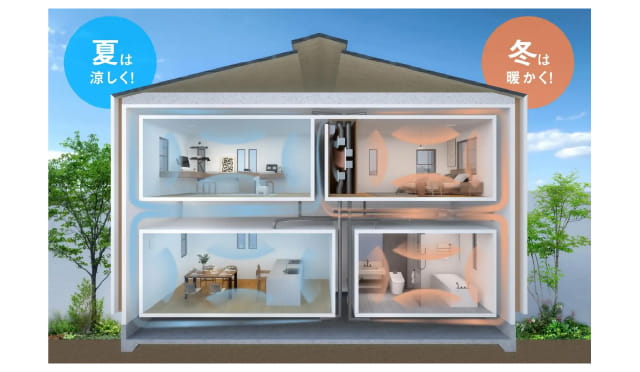 「壁体内通気層」の中の暖気が床・壁4面・天井を温めることで放出された遠赤外線によって、じんわりと部屋全体が暖かくなります。